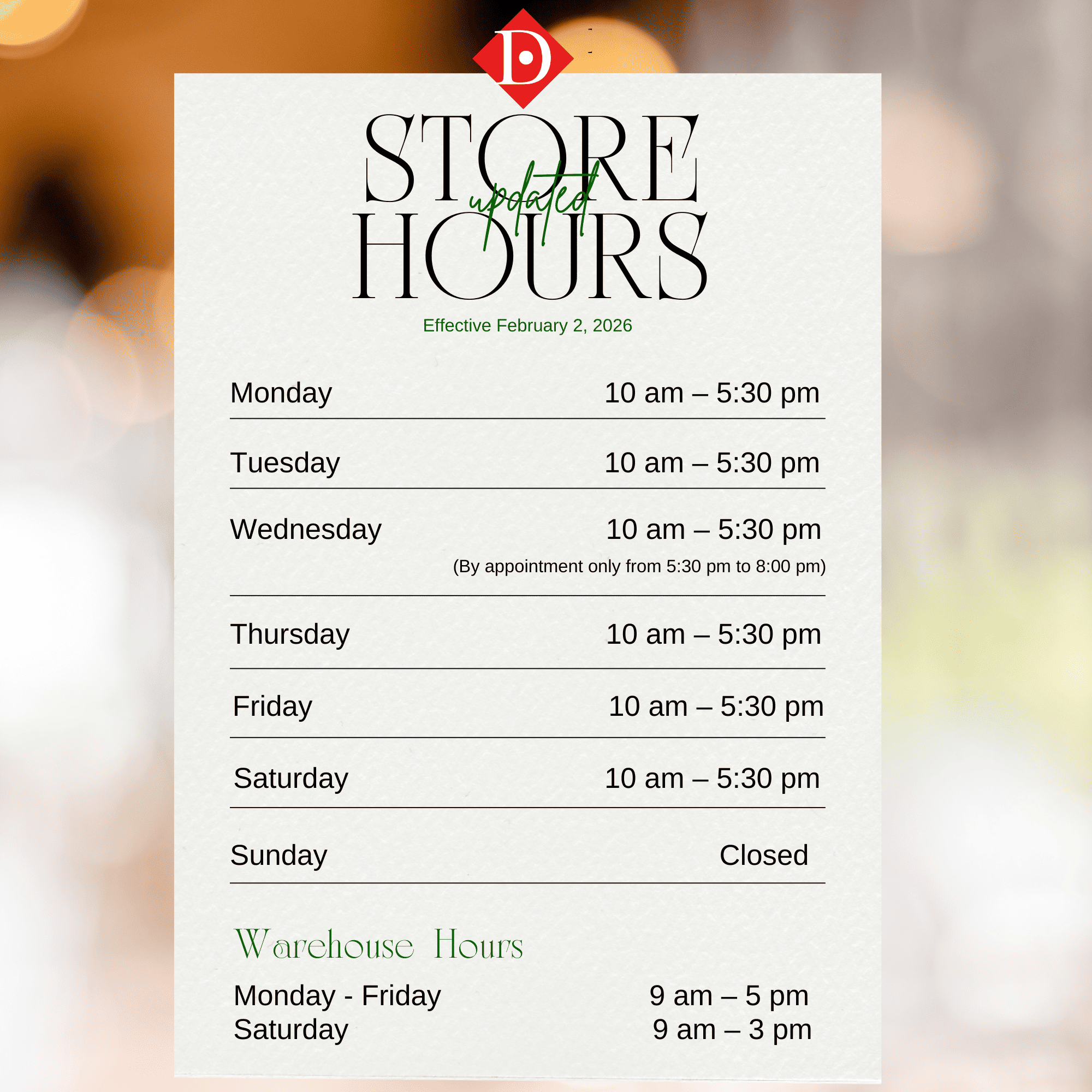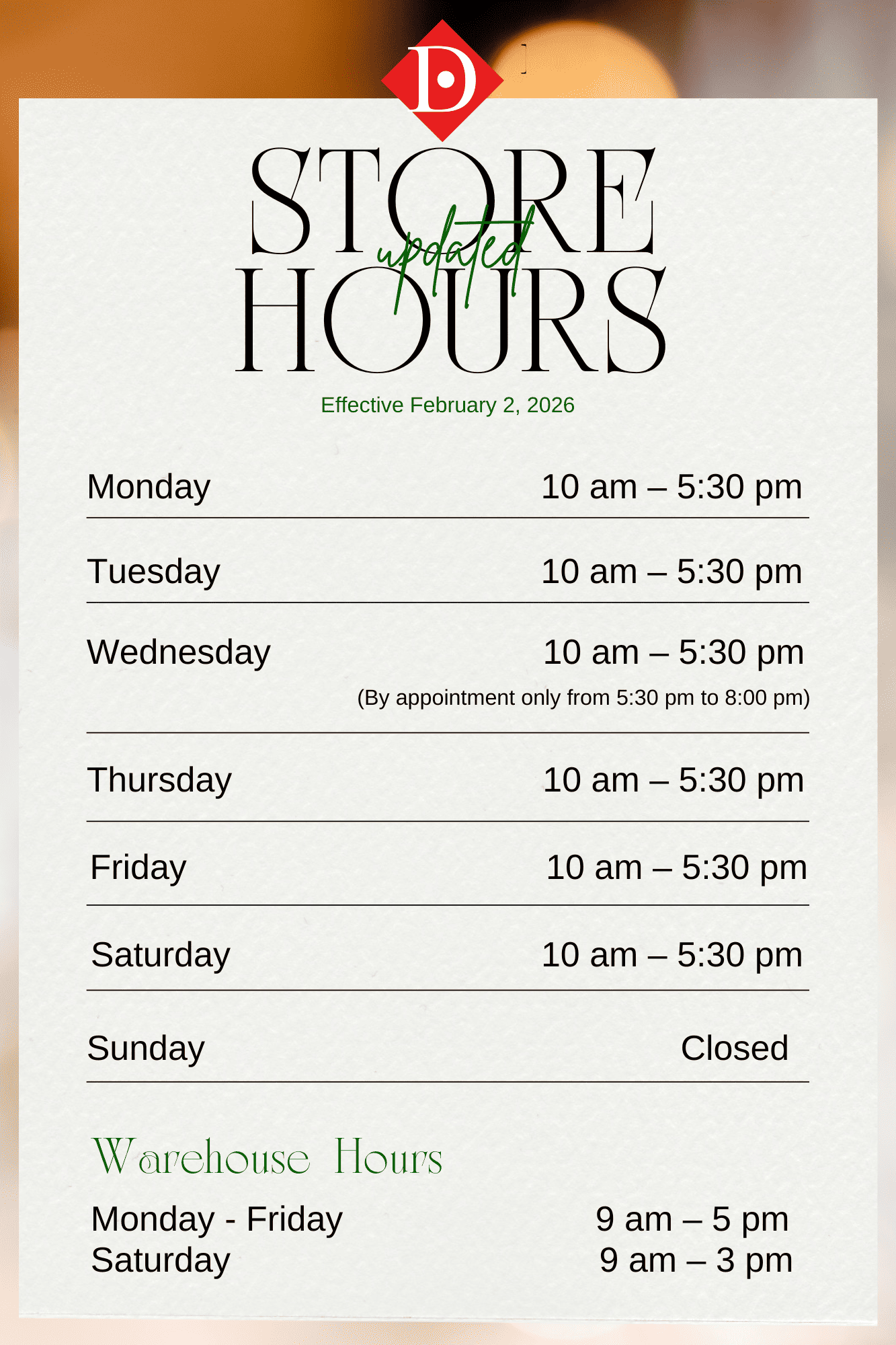 Beginning Monday, February 2nd, our showroom hours will be 10:00am–5:30pm, Monday–Saturday, with appointment-only evenings on Wednesdays (5:30–8:00pm).